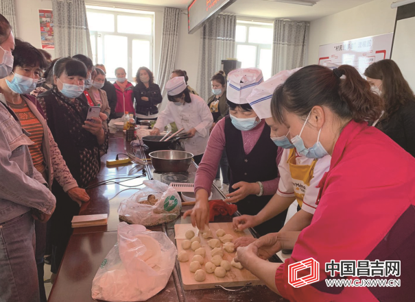 4月14日上午,在吉木萨尔县校场湖村,烹饪实操老师正在教妇女制作做麻团。陈晶 摄