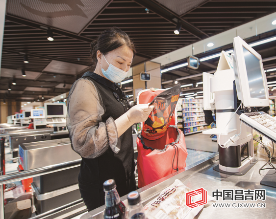 4月19日,在昌吉市延安南路的隆源品质生活超市,市民使用自备的布袋子装商品。 记者 巨海成 摄