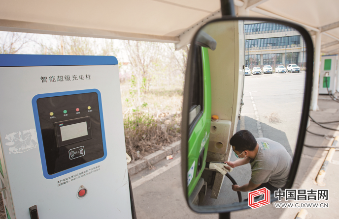 4月19日,驾驶员通过智能充电桩给电动物流车充电。记者 巨海成 摄