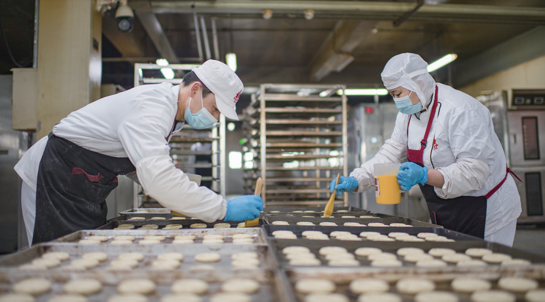 3月18日,在葡萄树食品有限公司生产车间里,工作人员在压好的亚麻籽馕上刷蛋液。 记者 何龙 摄