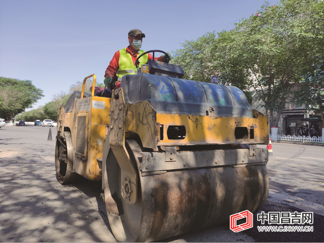 5月15日,在位于昌吉市宁边路的昌吉市人民医院前的机动车道上,伴随着工程机械的马达声,几名身穿黄色反光背心的工人正忙着对一翻浆坑槽进行沥青砂石料填铺,随后使用压路机械进行碾压,把道路恢复平整。