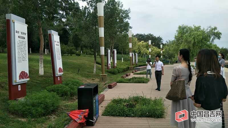 昌吉市相关领导及领导配偶代表在滨湖河廉政文化园参观廉政文化小品。