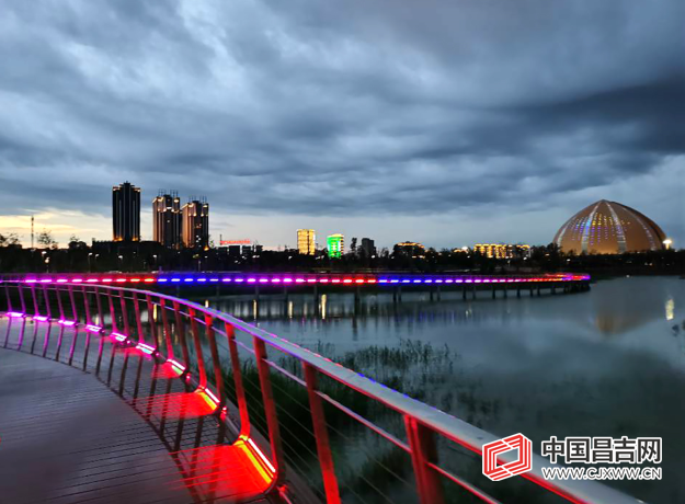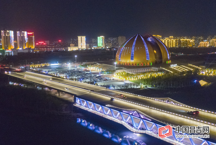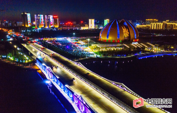 中国昌吉网讯(记者吴茜、通讯员唐明明)日光隐去,暮色四合,华灯初上。初秋的庭州之夜,以繁华的头屯河谷灯饰群为中心,主干道和头屯河景观带桥梁的华灯为纽带,万家灯火为背景,构成了一片错落有致、远近互映的灯的海洋。用灯光串联意境,尽显城市风情。8月20日晚,记者来到头屯河西岸新疆大剧院,欣赏这里的璀璨灯光秀。
