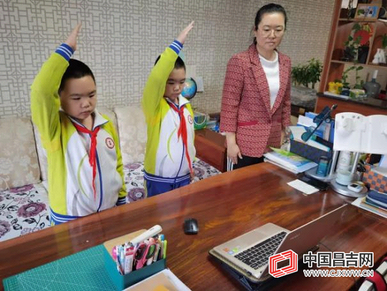 昌吉市第五小学学生和家长参加线上升国旗仪式。 万丽均 摄