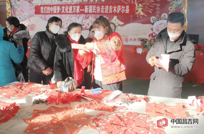 1月5日上午,在吉木萨尔县二工镇董家湾村文化室,来自新疆民间文艺家协会小分队的书法家和剪纸艺人为村民写春联、剪窗花、送“福”字,为村民送去新春的祝福,为节日增添浓浓的年味。
