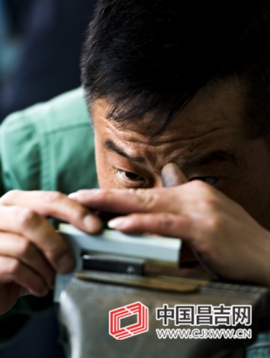 装配钳工比赛现场,选手在仔细测量模具高度。 记者 何龙 摄
