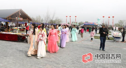 422日,身着汉服的游客畅游玛纳斯县桃园广场。