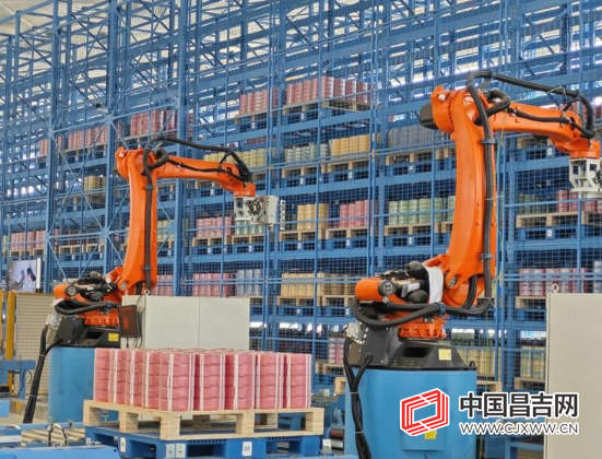 5月31日,在特变电工智能电缆产业园数字化布电线车间,两台自动码垛机器人正在作业。 记者 常谊谊 摄