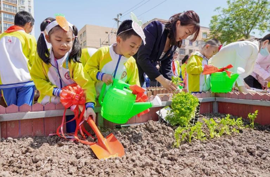 图为昌吉市第五小学开展的劳动教育课上,学生在老师的组织下种植蔬菜。