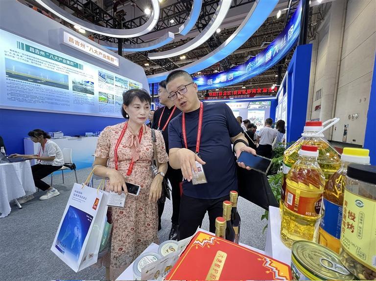 9月8日,参展嘉宾在第二十三届中国国际投资贸易洽谈会昌吉州展区参观。 记者 巨海成 摄