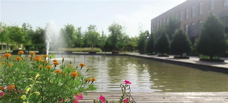 9月1日,新疆笑厨食品有限公司内的一处景观水池水声潺潺,花丛林带错落有致。该公司采用了现代化污水处理设备,处理过的污水用来浇花、打造水景等。 记者 王薇 摄