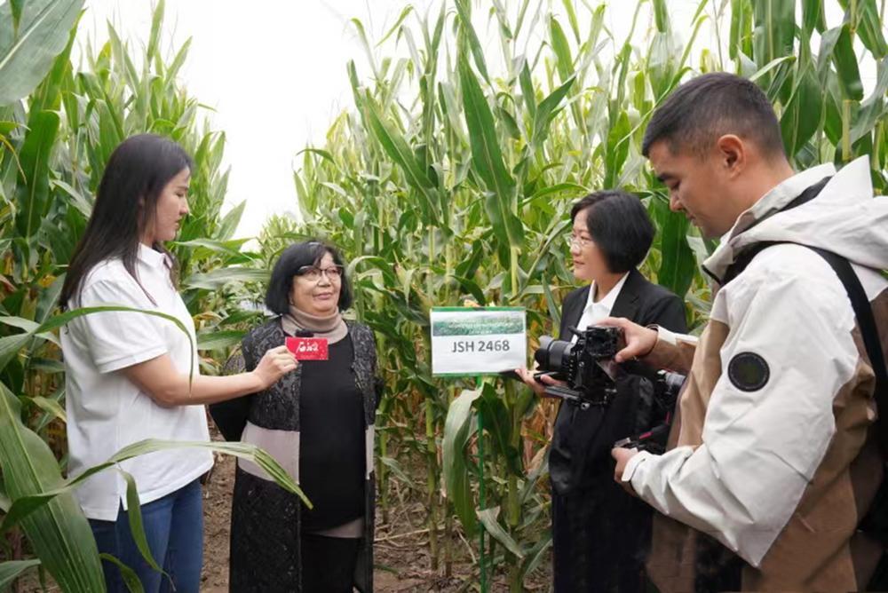9月14日,在九圣禾种业阿拉木图的农作物展示示范基地,专家向新疆日报采访小分队介绍“九圣禾2468”的生长情况。石榴云/新疆日报记者 王琦铭 摄