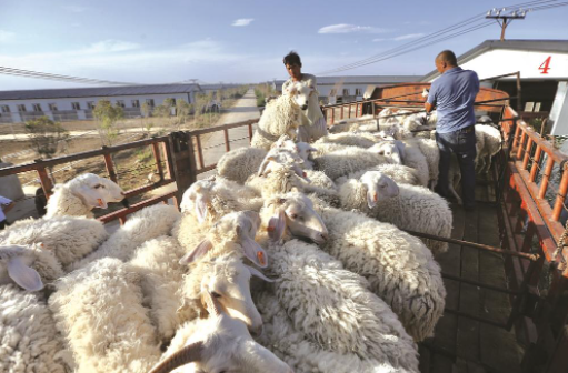 木垒县雪牧生物科技有限公司养殖场的工作人员将羊装车。(资料图片) 记者 何龙 摄