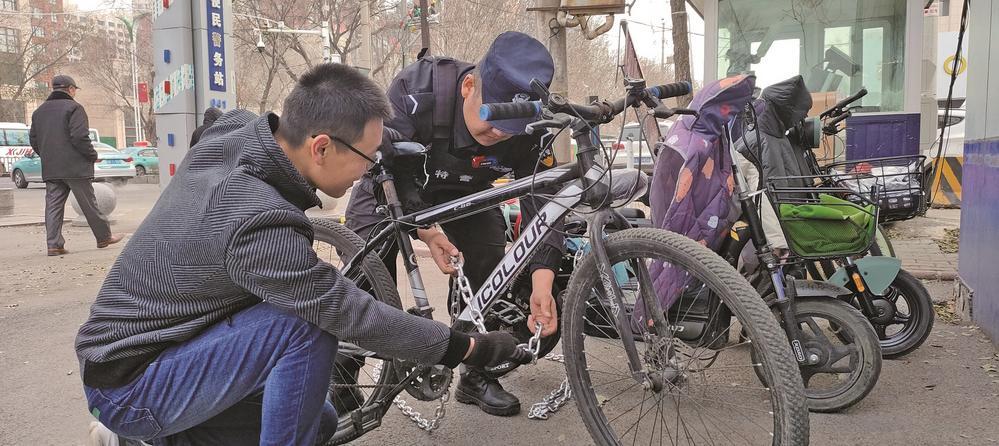 12月9日,昌吉市公安局北京南路派出所亚中车站便民警务站的警务人员将未落锁自行车还给市民。记者 廖冬云 摄