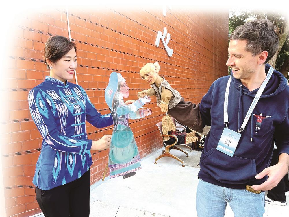 新疆皮影演员和外国专业院团演员在交流皮影戏表演技巧。 梁宏涛 摄
