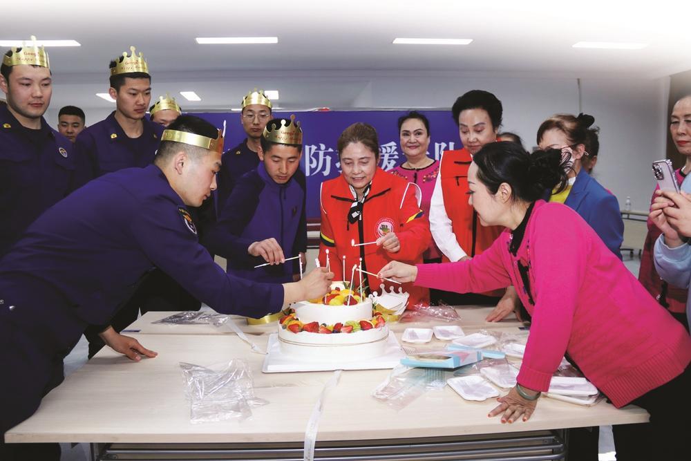 5月4日,昌吉市消防救援大队活动室,昌吉市新时代文明实践苏玉琴志愿服务工作站“生命之光”兵妈妈志愿者服务队的志愿者和消防员一起点燃生日蜡烛。记者 付小芳 摄