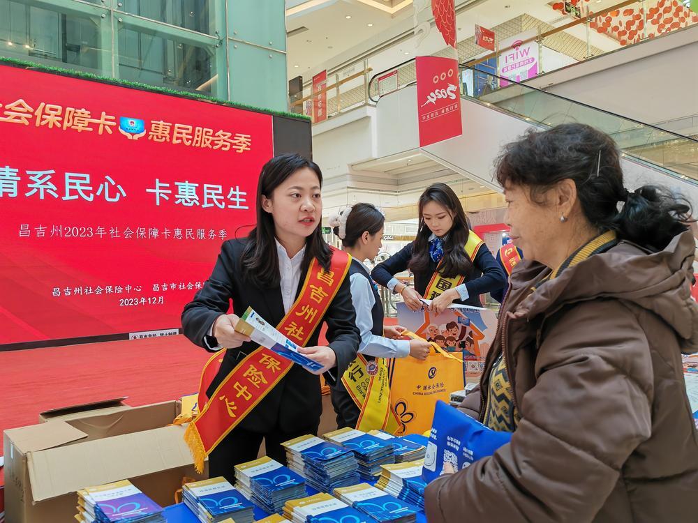 中国昌吉网讯(记者马晓芳、通讯员赵璐琦报道)2023年12月23日,昌吉市华洋广场内人头攒动,昌吉州2023年“社会保障卡惠民服务季”主场宣传咨询服务活动在这里举办。记者在现场看到,工作人员在咨询服务台前热情地为群众讲解社保卡的功能、电子社保卡的申领流程等,并向群众发放了宣传册、宣传单等。