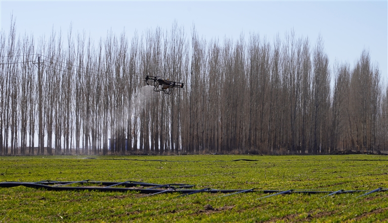 近日,吉木萨尔县北庭镇东二畦村利用无人机对1300亩冬小麦进行施肥作业,雾状肥料均匀洒在田地里。  马文婷摄
