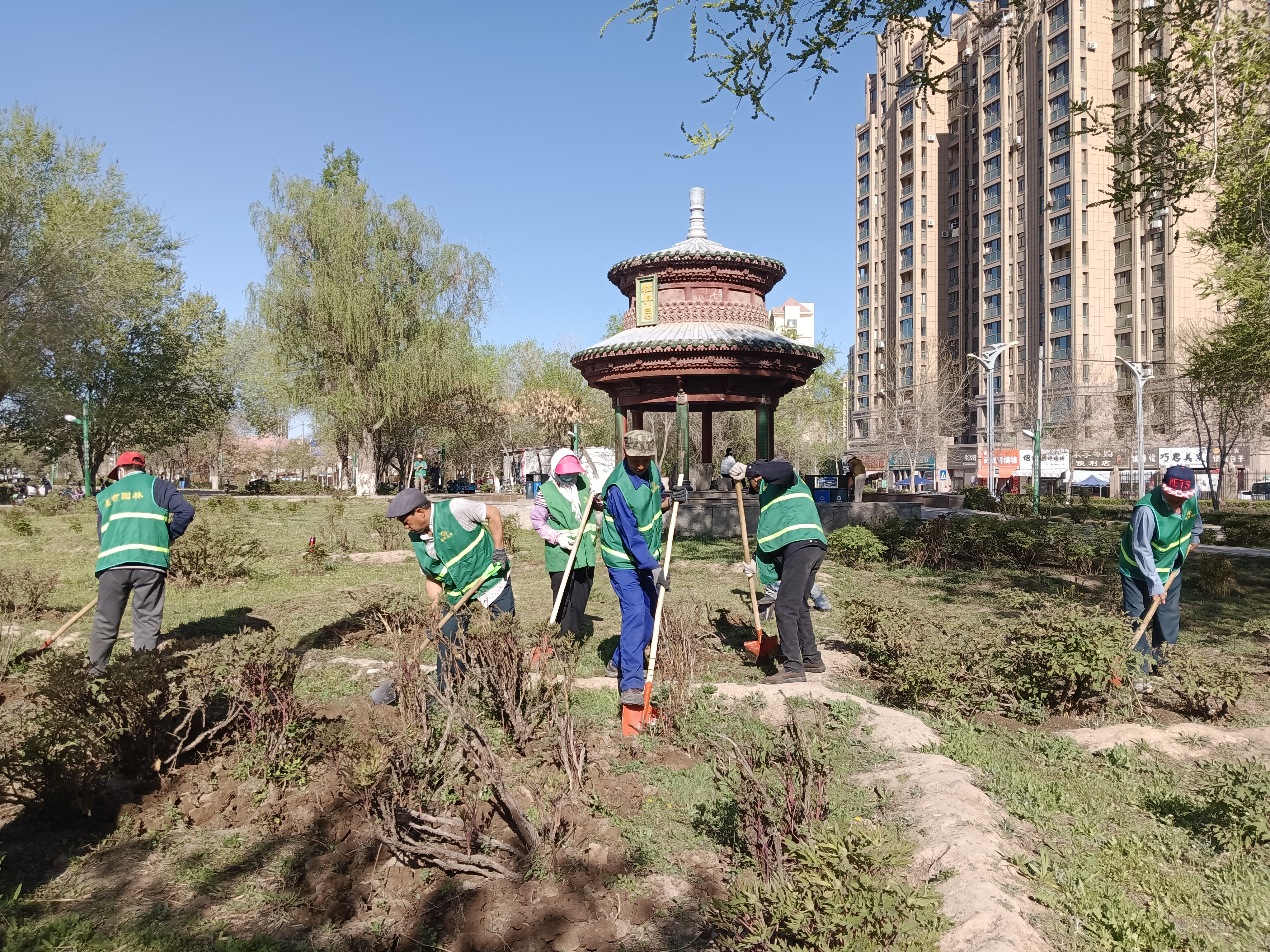 “再过一周左右的时间,这里的牡丹就开始陆续开花了……”4月25日,昌吉市园林绿化管理中心宁边路绿化管理所所长郝云飞带着园林工人对滨湖河景区牡丹园里的牡丹进行开花前期的养护管理。