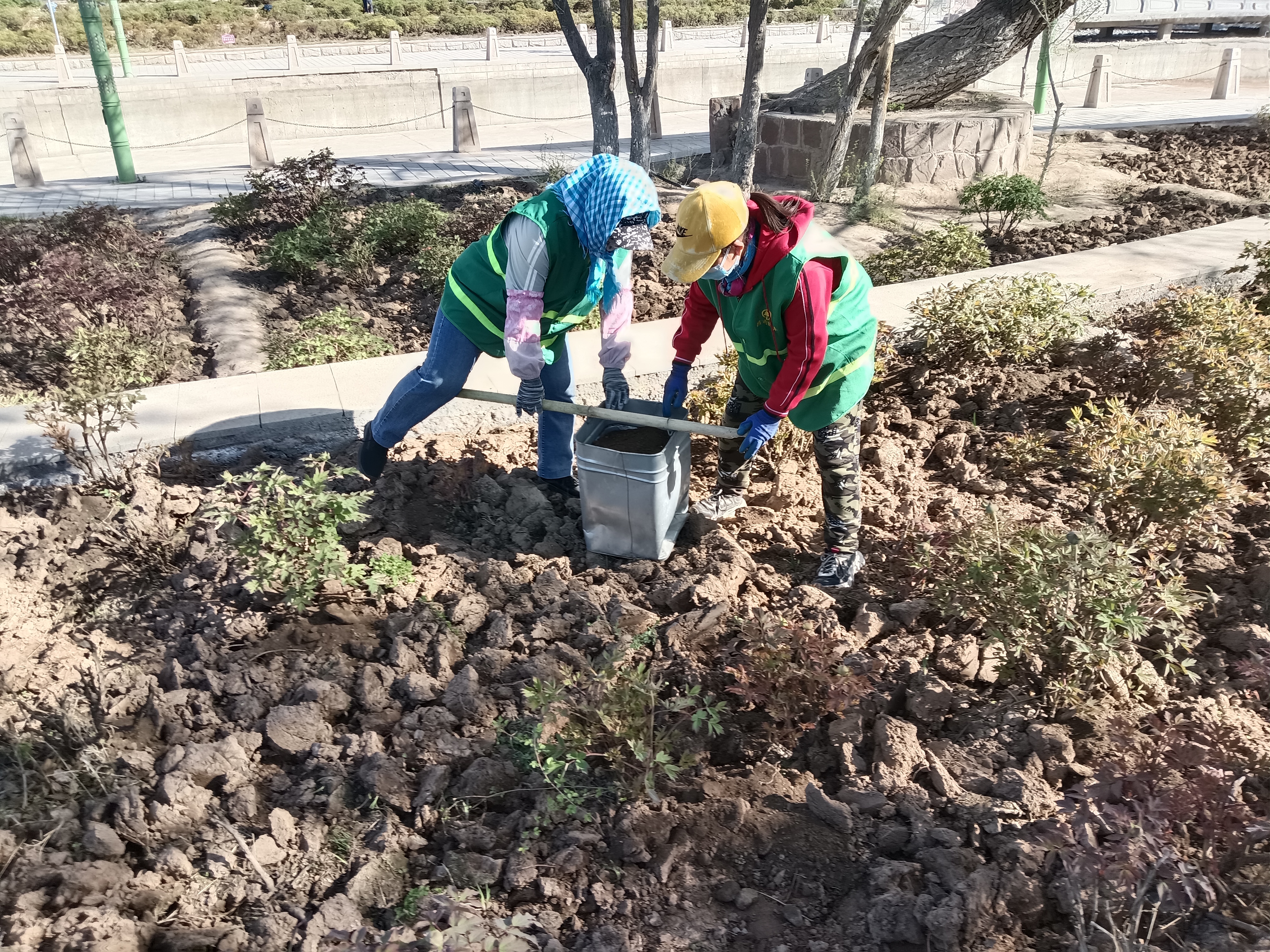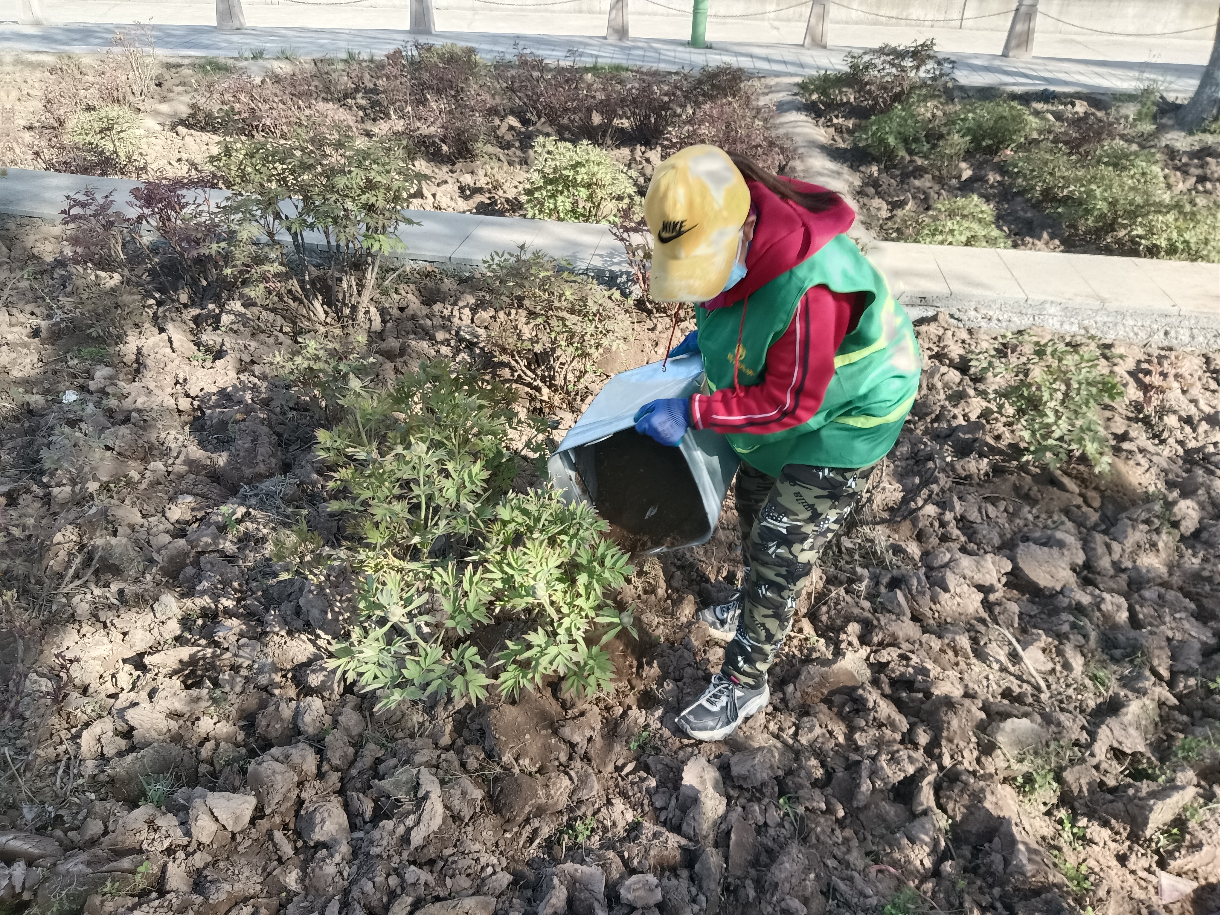 在滨湖河畔的牡丹园,园林工人们正在为今年牡丹花的盛开而忙碌着。他们对部分牡丹枯枝、弱枝进行修剪,然后在每条主枝上保留2-3条侧枝,以减少牡丹的养分消耗,保障主枝茁壮生长。两名工人背着电动除草机正在除草,随着马达的轰鸣声,杂草纷纷被除草机快速旋转的刀片切断。还有几名工人提着水桶,他们将桶里装的复合肥料撒到每株牡丹的根部,然后再进行填埋,每一个步骤做的都非常仔细。