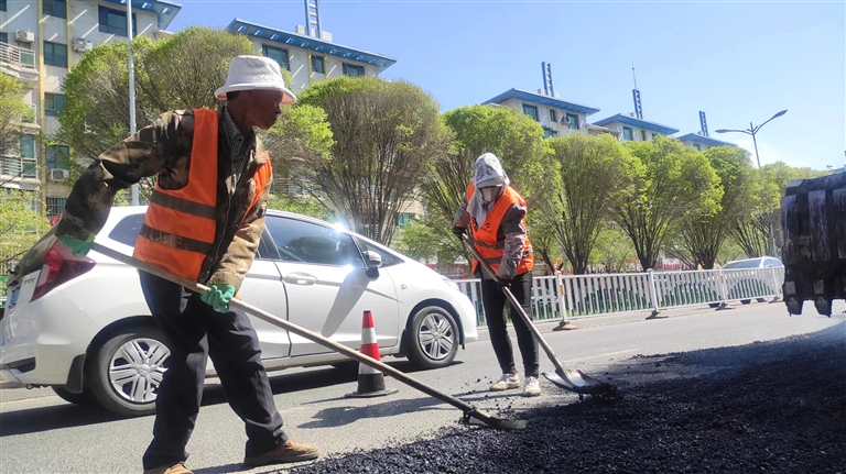 4月29日,在昌吉市南公园西路,市政养护工人正在修补路面坑槽。  贾兴旺摄