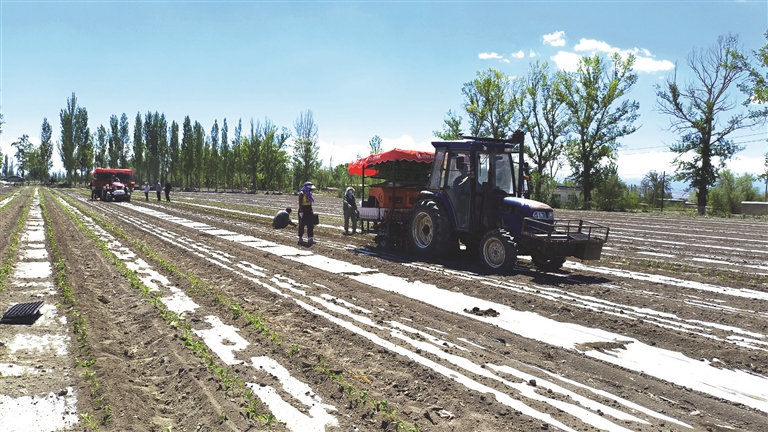 在吉木萨尔县北庭镇泉水地村的辣椒基地,两台辣椒移栽机在人工配合下移栽辣椒苗。 周静静摄