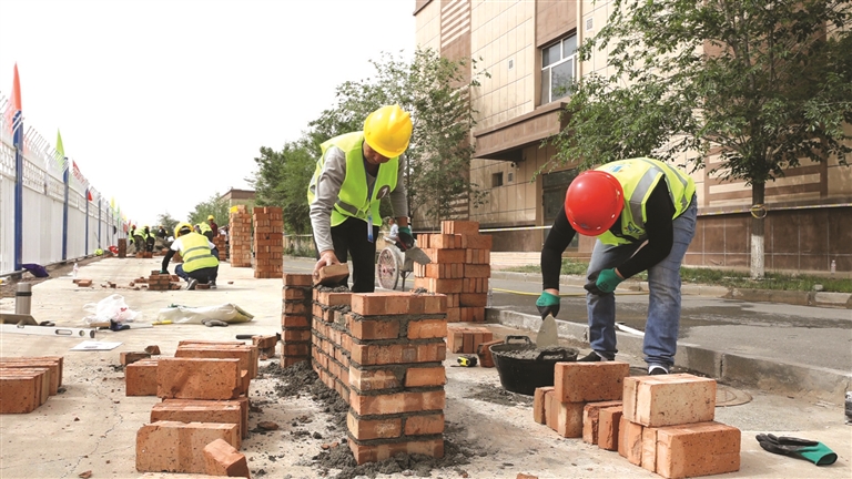 在砌筑赛区,参赛选手们一字排开,忙着排砖、切砖、砌筑、放线。 叶 钰摄