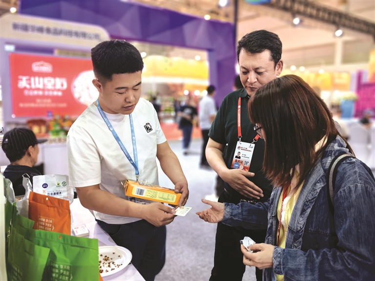 昌吉州参展企业工作人员向自治区农业农村厅优质农产品产销服务中心干部贺娇龙介绍产品。