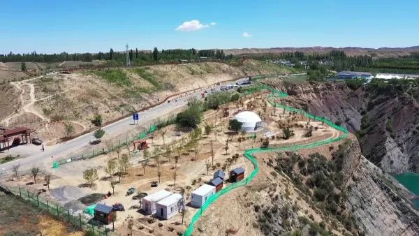 新疆百里丹霞野奢营地酒店项目施工现场负责人曹奇说:“目前,这个项目绿化工作方面,树木栽植已经完成,游客中心已经建成,现在我们正在安装架空帐篷,预计7月底投入使用。”