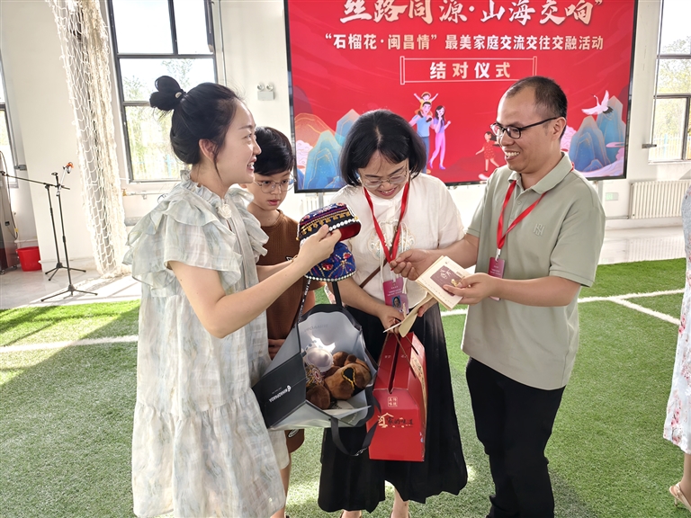 7月8日,“丝路同源·山海交响”“石榴花·闽昌情 ”最美家庭交往交流交融活动现场,两地家庭相互赠送礼物。记者 阿依加玛丽·列提甫摄