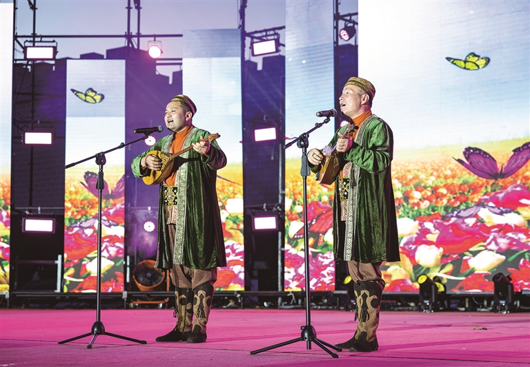 7月15日,吉木萨尔县北庭园广场,来自昌吉市的达尔汗组合在演唱《尕妹是牡丹花中王》。 记者 何 龙摄