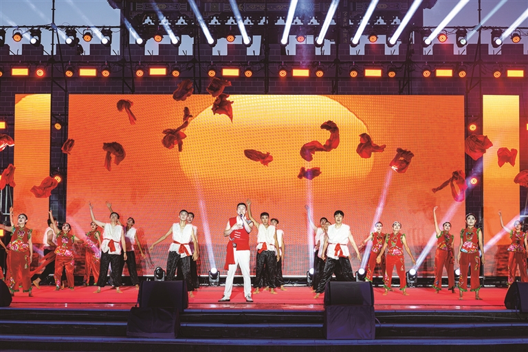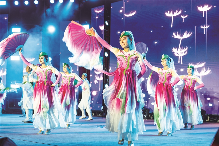 7月15日,吉木萨尔县北庭园广场,演员在表演歌伴舞《花儿与少年》。 记者 何 龙摄
