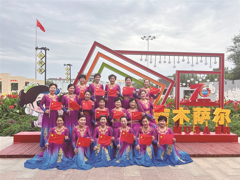 8月30日,文艺队员身着演出服,在北庭园州庆主题标志前拍照打卡。魏 平摄