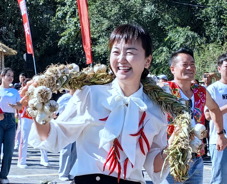 村民手里握着蒜头,脖上绕着辫蒜,跳起了喜庆的秧歌。记者 王 薇摄