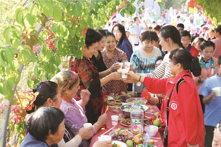 9月24日,呼图壁县呼图壁镇举行“家国同庆 和谐邻里”活动。各族干部群众欢聚一堂,同吃一桌饭、共话团结情,庆祝新中国成立75周年。张 澜摄