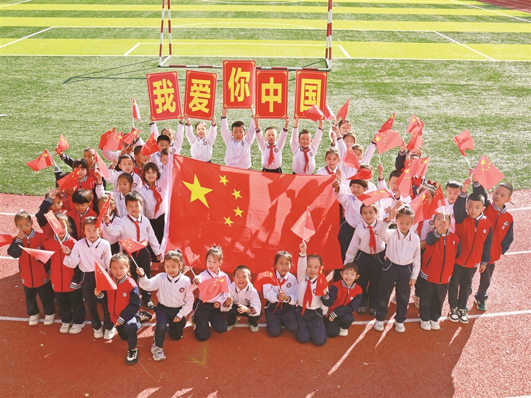 9月30日,阜康市第一小学的学生与国旗合影,纯真的笑脸与国旗相映成辉。 古丽米娜·阿不都摄