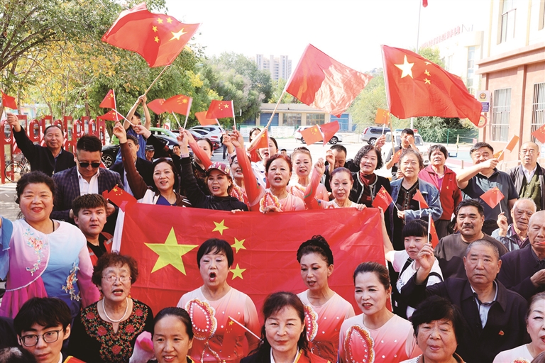 9月26日,昌吉市北京南路街道油运基地社区开展迎国庆主题活动,各族居民载歌载舞,合唱《今天是你的生日,我的中国》。梁宏涛摄