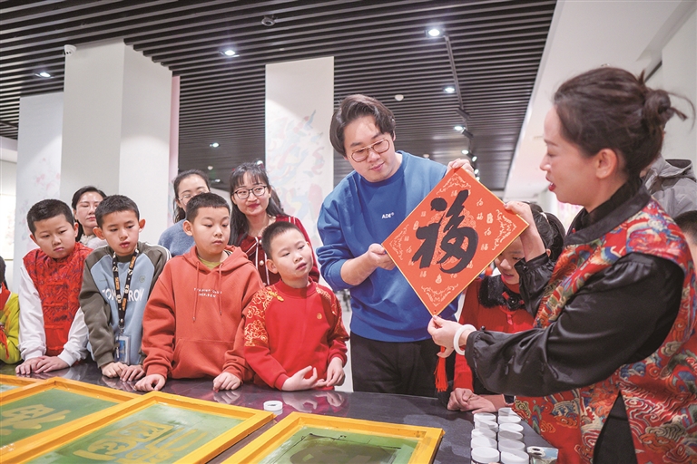 此昌吉州美术馆以“美术馆里过大年”为主题,为市民们呈上了一道充满传统韵味与民俗风情的文化大餐,让人们在艺术的殿堂里沉浸式体验非物质文化遗产的独特魅力。活动现场热闹非凡,人头攒动。昌吉市第五小学的50余名学生和家长以及众多书画爱好者也积极融入其中,他们穿梭于各个活动区域,好奇地探索着每一项传统技艺。在工作人员的悉心指导下,现场观众纷纷挽起袖子,体验拓印版画这一古老工艺。孩子们瞪大眼睛,全神贯注地将纸张轻轻覆盖在雕版上,小心翼翼地用刷子蘸墨涂抹,随着图案逐渐在纸上清晰呈现,他们脸上露出了开心的笑容。昌吉市第五小学四年级学生王紫涵说:“我制作了一个‘福’字版画,我感觉很新鲜,回去我要拿给我的朋友看,让他们也来感受中国传统文化的魅力。”