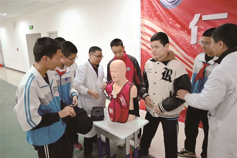 近日,福州援疆医疗专家在奇台县第五中学开展“海姆立克急救法”专项培训,现场示范急救操作过程。 庄 研摄