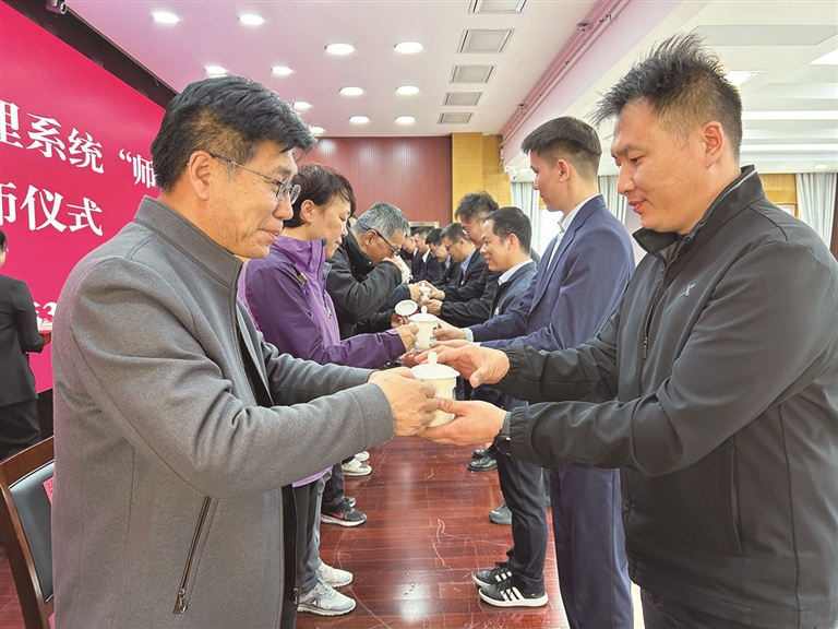拜师仪式上,学徒们向师傅敬茶。 张丁尹摄