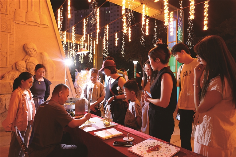当然,最热闹的还要数民俗体验区。现场不少群众手持任务卡,穿梭于各个游戏点位之间,参与“乞巧穿针”“诗词飞花令”“真情告白”等民俗体验互动游戏。现场不少市民还参与制作了漆扇、糖画、婚书。