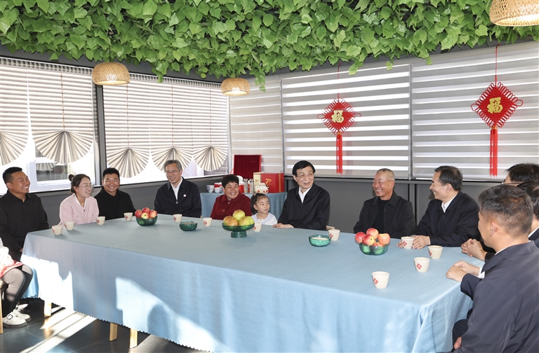 9月26日,受习近平总书记嘱托,中共中央政治局常委、全国政协主席、中央代表团团长王沪宁带领中央代表团部分成员到新疆生产建设兵团第二师铁门关市、第十师北屯市考察。这是王沪宁和中央代表团部分成员在兵团第十师北屯市同职工群众交流。 新华社记者 姚大伟摄