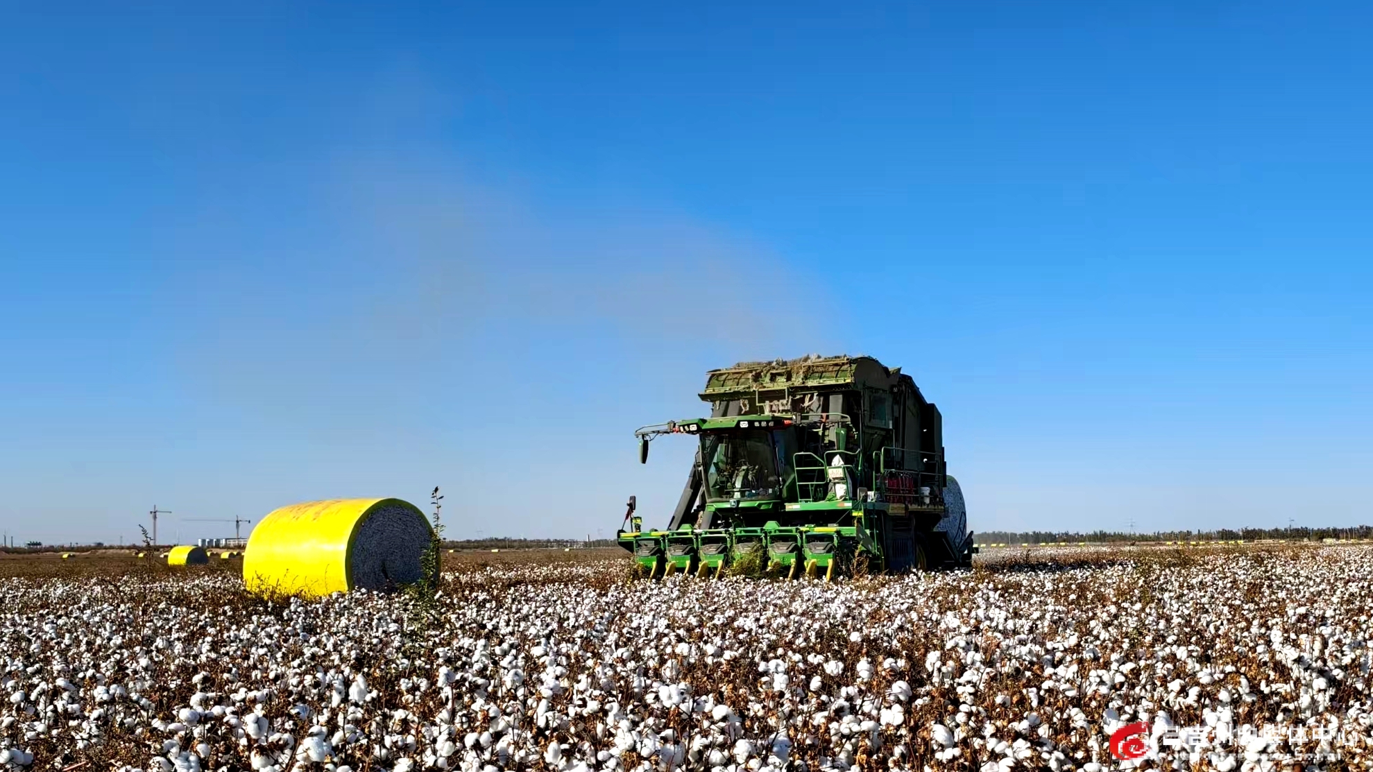 丝路昌吉/昌吉州融媒体中心讯(记者 王薇报道)10月10日,昌吉国家农业高新技术产业示范区(以下简称昌吉国家农高区)的一片棉田里,两台自走式打包采棉机在棉田里来回穿梭,雪白的棉絮被快速卷入机身,少顷在机尾“吐”出一个“金蛋蛋”……这是今秋昌吉州棉花丰收的一个场景。