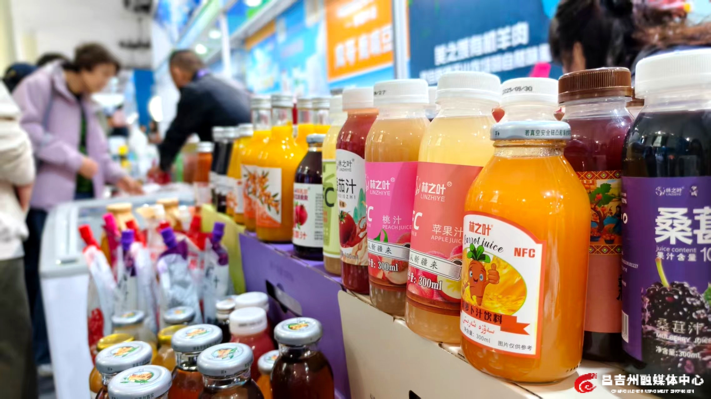 新疆农产品北京交易会上展出的笑厨番茄汁、枸杞汁等产品。记者王薇 摄