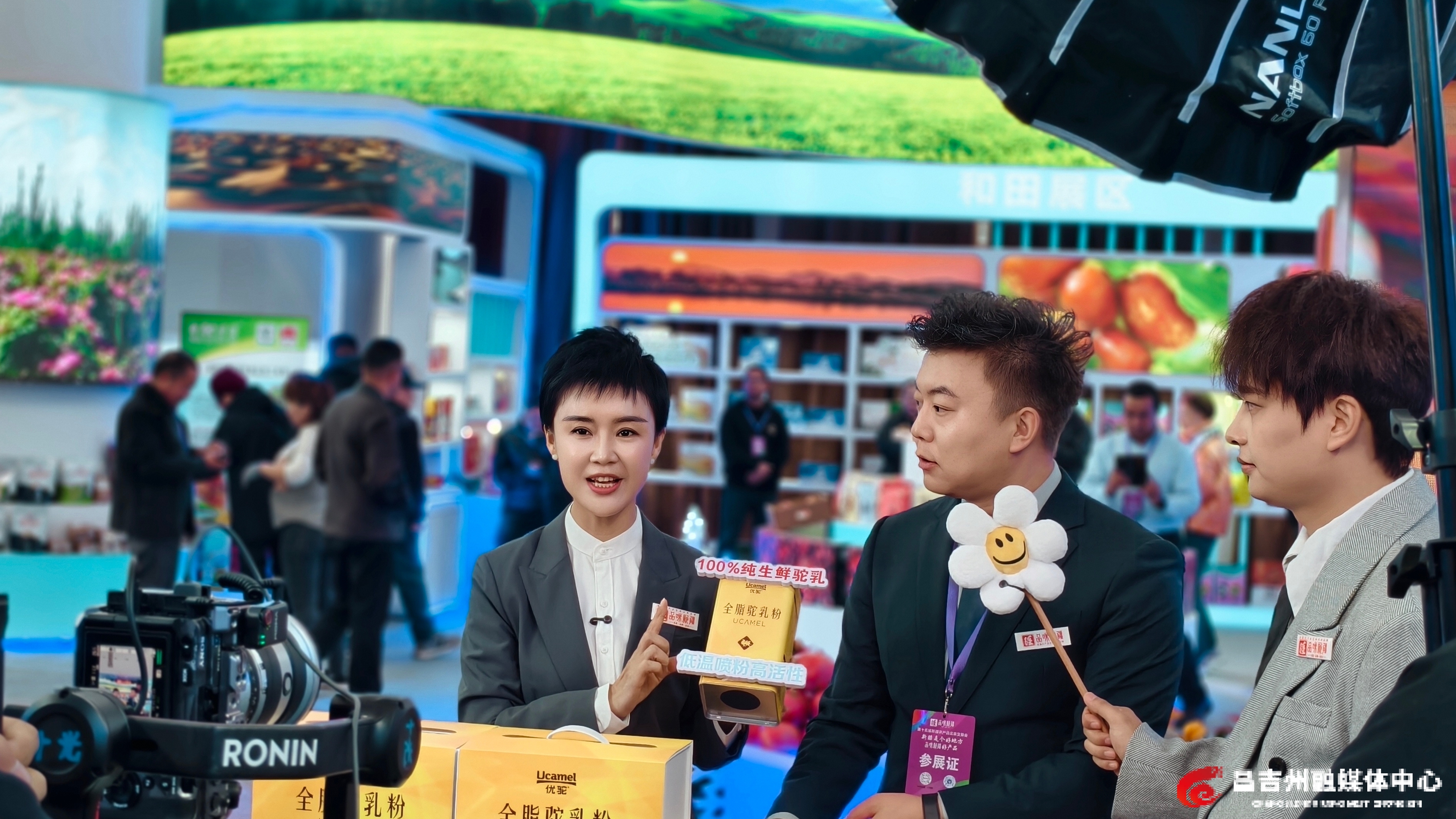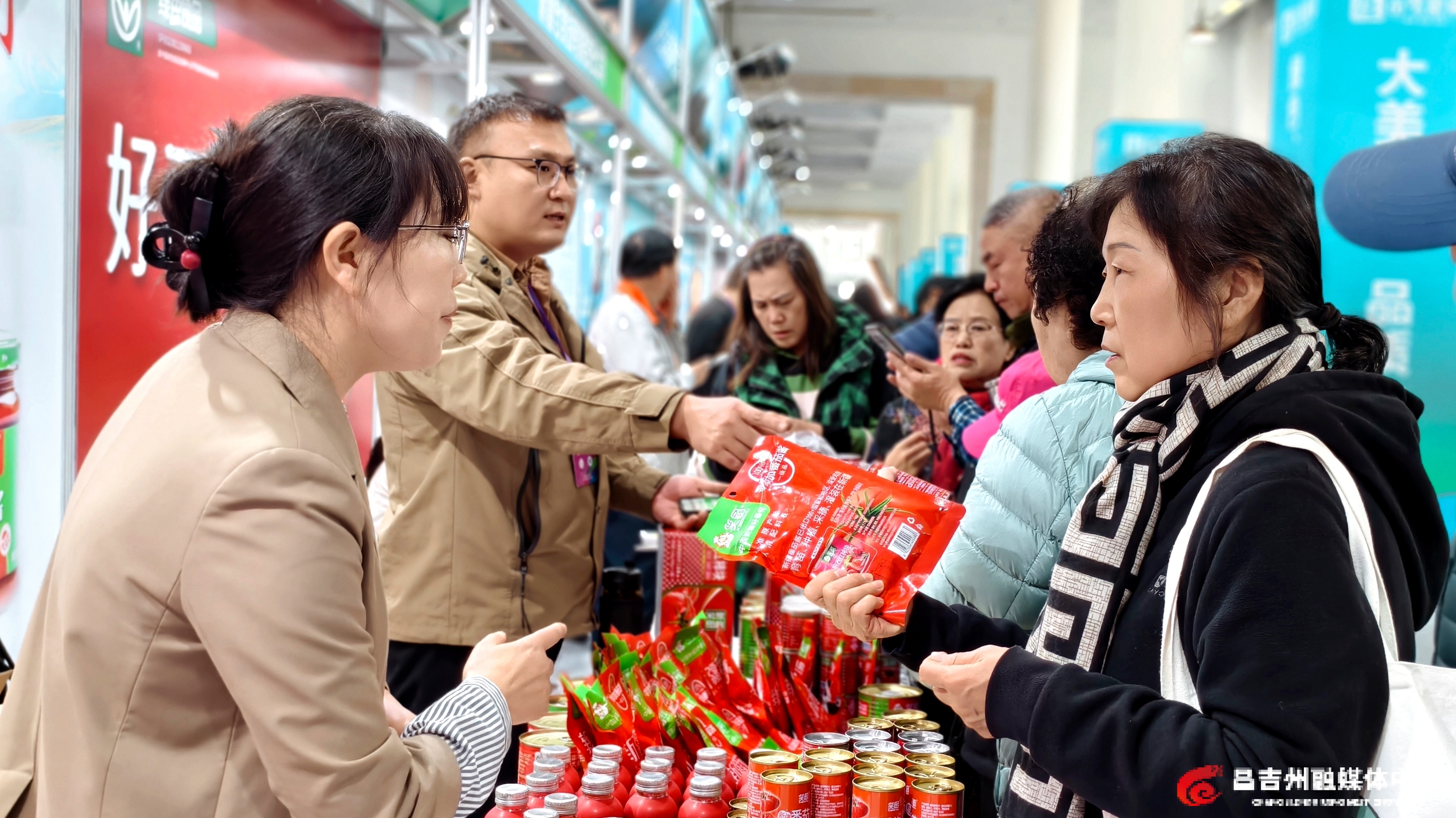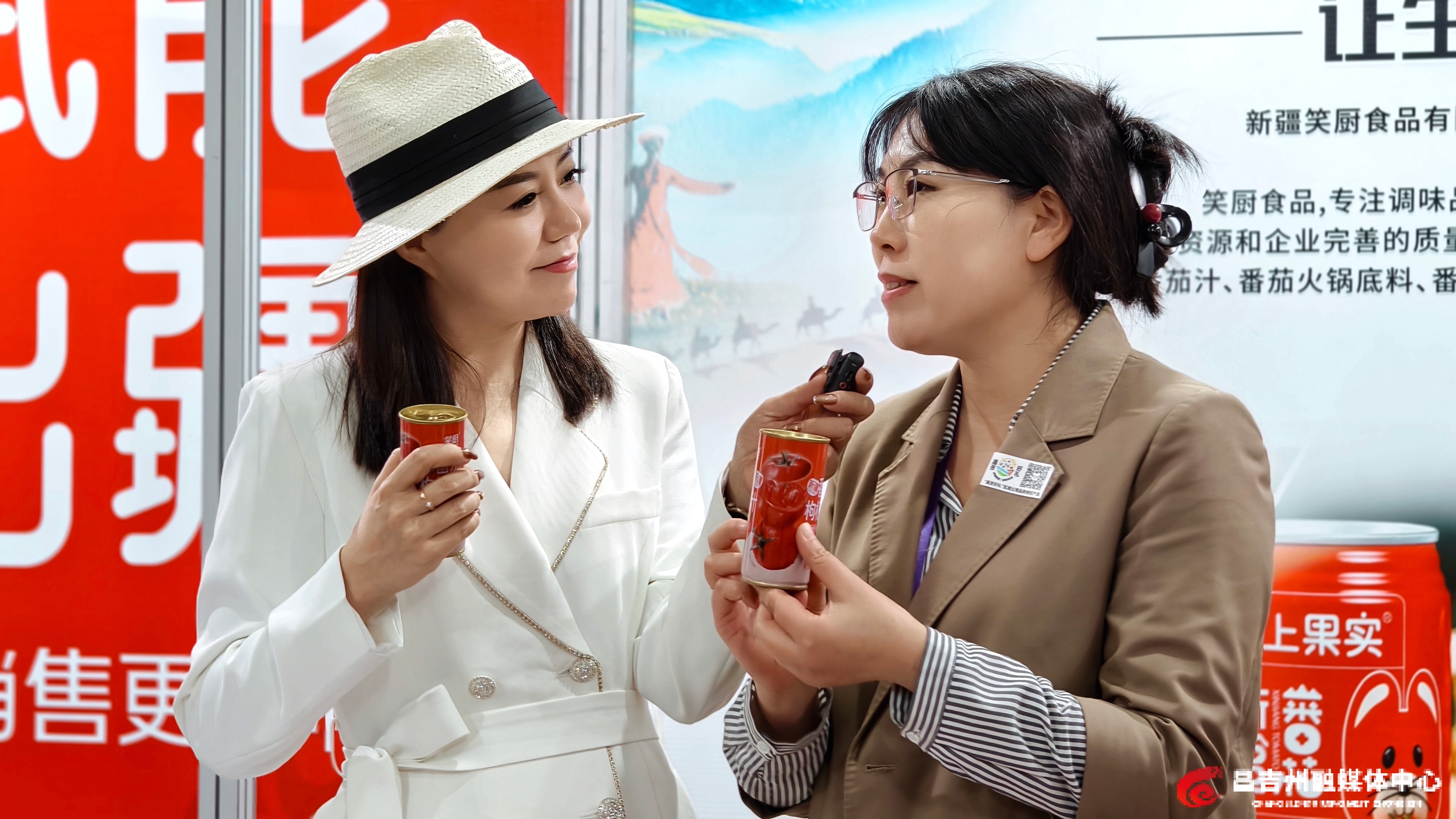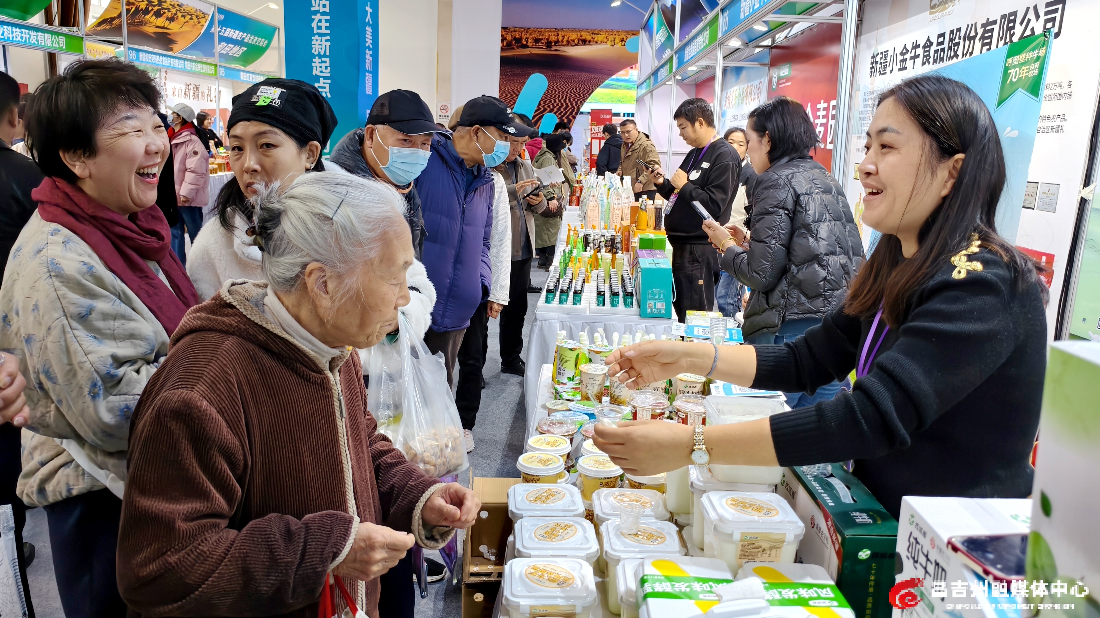 昌吉州展区装饰装修特色鲜明,天山天池的碧水荡漾,丹霞地貌一片赤红色,与货架上番茄酱的鲜红、鹰嘴豆的浅黄、酸奶的纯白相映成趣,勾勒出昌吉州农牧业高质量发展的鲜活图景。