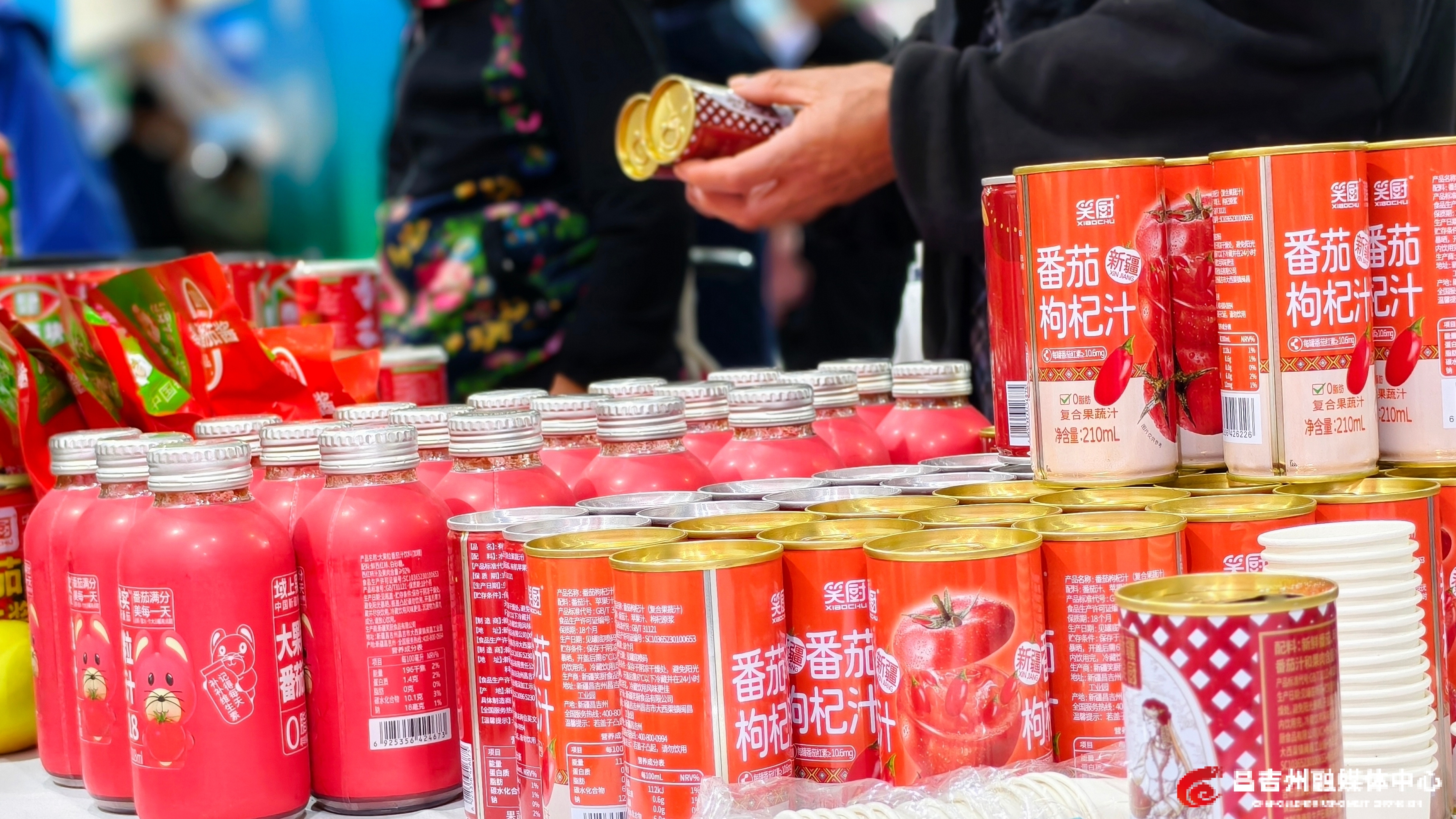新疆农产品北京交易会昌吉州展区展出的笑厨番茄枸杞汁、番茄块等产品。记者王薇 摄