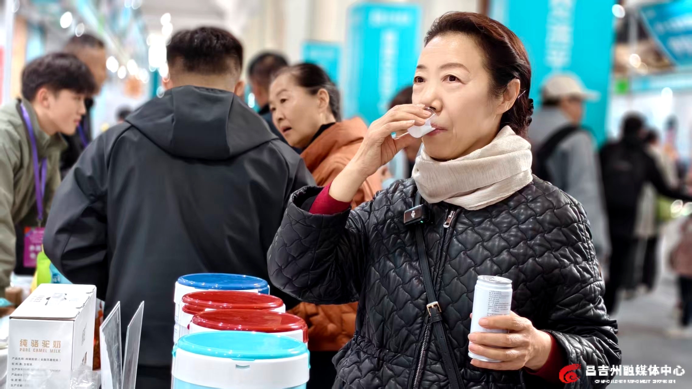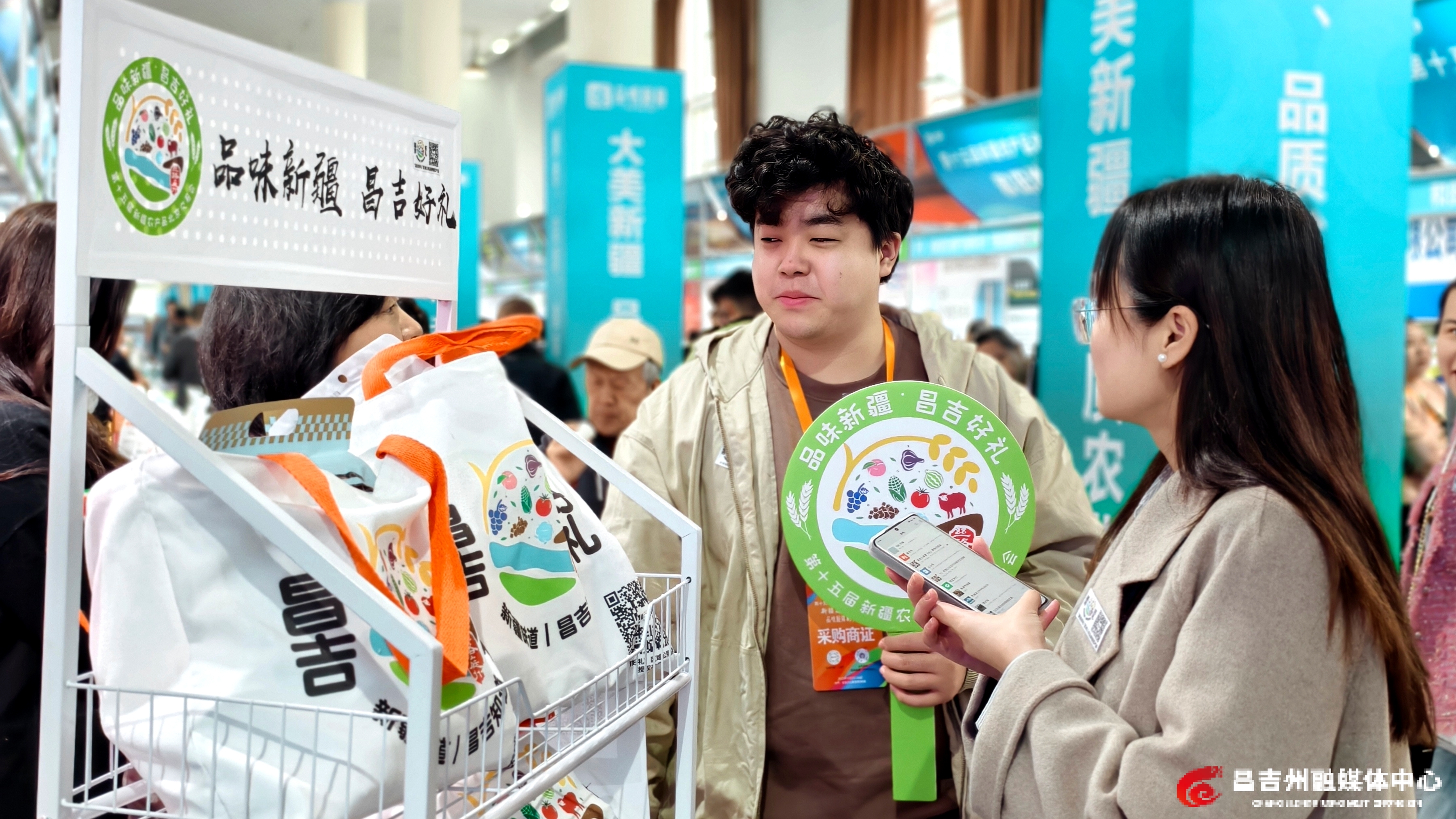 昌吉州展区出入口处,3个“品味新疆 昌吉好礼”展架格外显眼。礼袋内装着牛奶、驼奶、番茄汁、鹰嘴豆等9种特色产品,每袋仅售99元,扫描二维码,即可直接获取购买网点链接,便捷又省心。