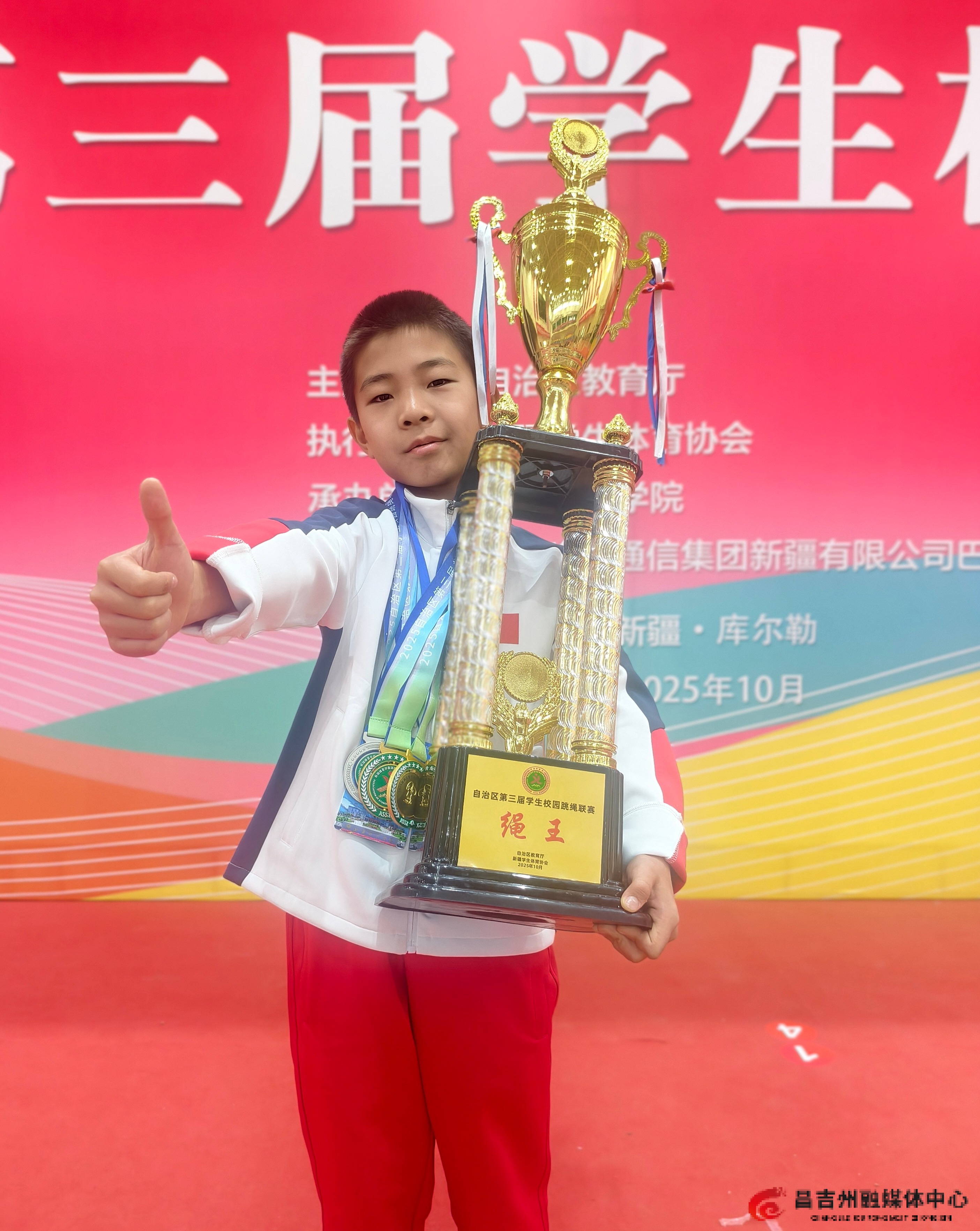 丝路昌吉/昌吉州融媒体中心讯(记者 荷苒·马汗报道)10月24日至27日,自治区第三届学生校园跳绳联赛在新疆科技学院金河校区体育馆举办。代表昌吉州参加小学组与中学组赛事的阜康市24名运动员表现卓越,不仅在小学组与中学组分别以95分和97分的成绩双双荣获团体第一名,更在单项赛事中实现奖牌总数“断层领先”。尤其值得一提的是,阜康市晋阜小学六年级(5)班学生常铭凭借出色发挥,勇夺本届赛事“绳王”称号。