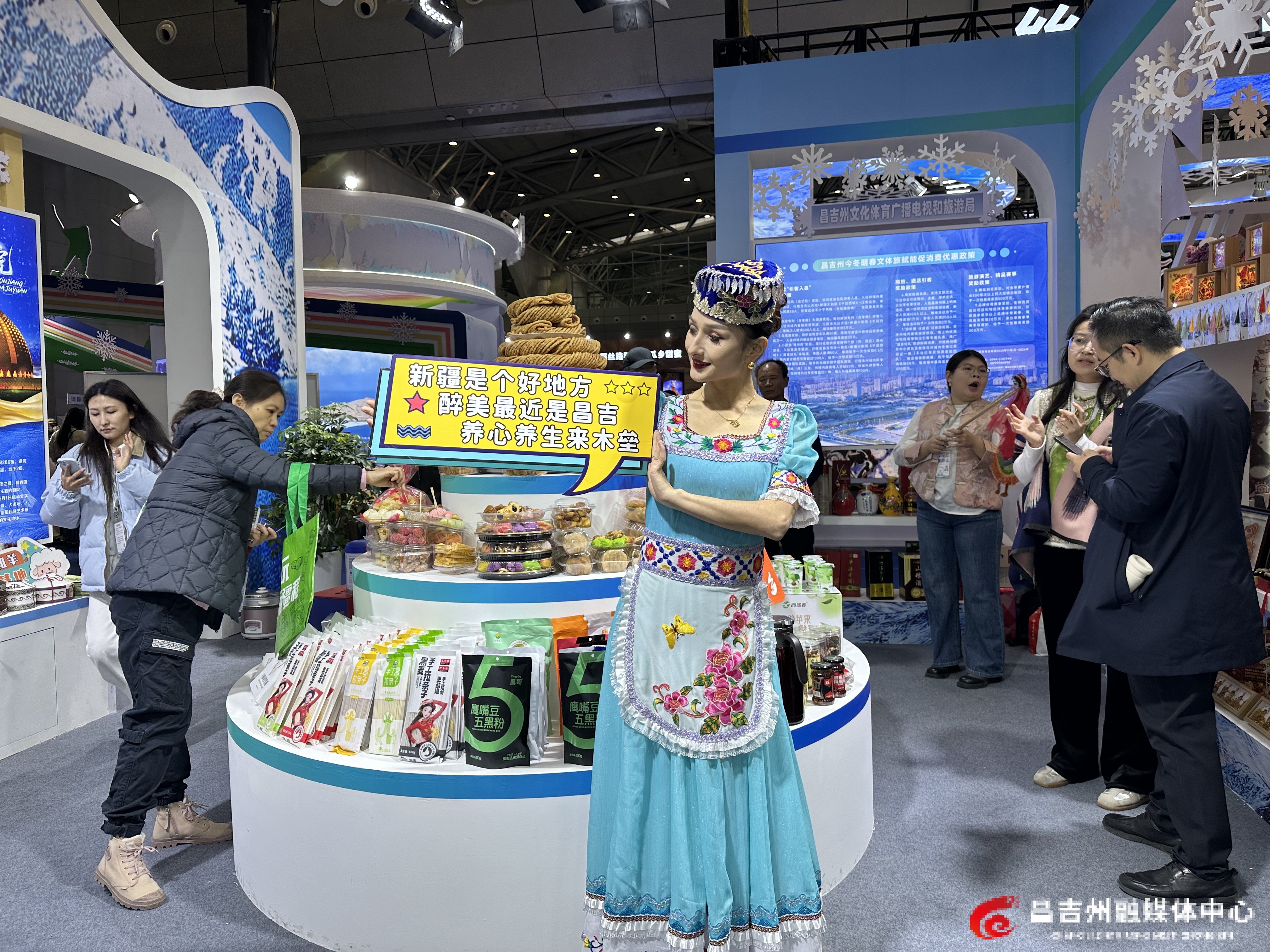 走进新疆国际会展中心4号馆昌吉州展厅,油糕、馓子、椒麻鸡等特色美食香气扑鼻、格外诱人,只见参展商一边品尝着美食,一边翻看着旅游推介手册了解昌吉州的特色旅游资源。天山天池明信片、北庭套杯、葫芦雕刻等精美文创产品备受游客青睐,奇台腰站子面粉、木垒鹰嘴豆、葡萄酒等特色农副产品深受欢迎。展厅外,LED大屏幕上滚动播放着昌吉州旅游宣传推介片,新疆花儿等特色歌舞表演吸引游客驻足。活动现场,天山天池滑雪场、五江温泉城、玛纳斯国家湿地公园等景区工作人员还为过往游客免费赠票。