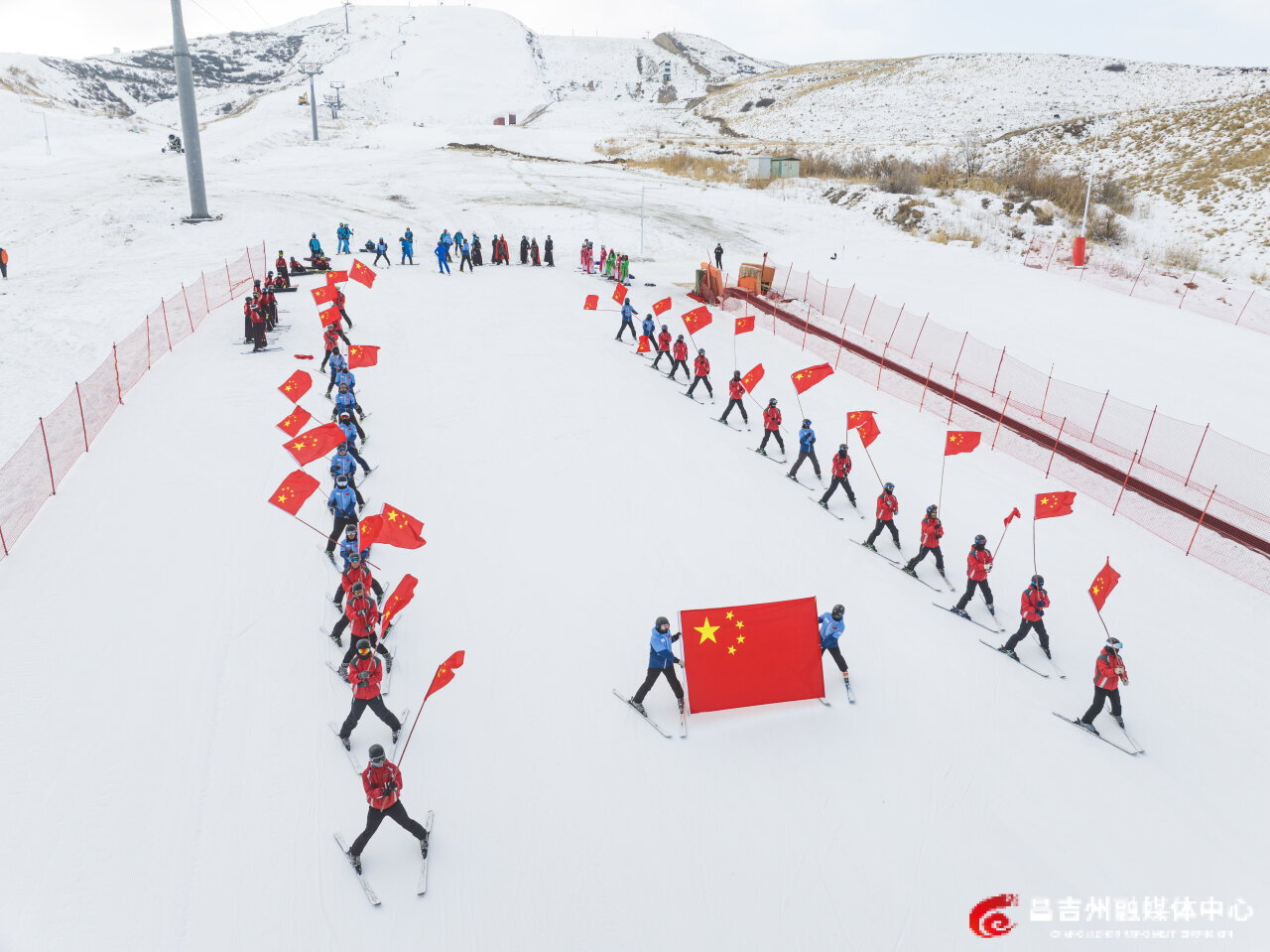12月6日,昌吉州“冬游天山别样暖”冰雪嘉年华暨阜康市冰雪风情季、天山天池国际滑雪场开板仪式活动现场,国旗滑雪方队从山坡滑下。